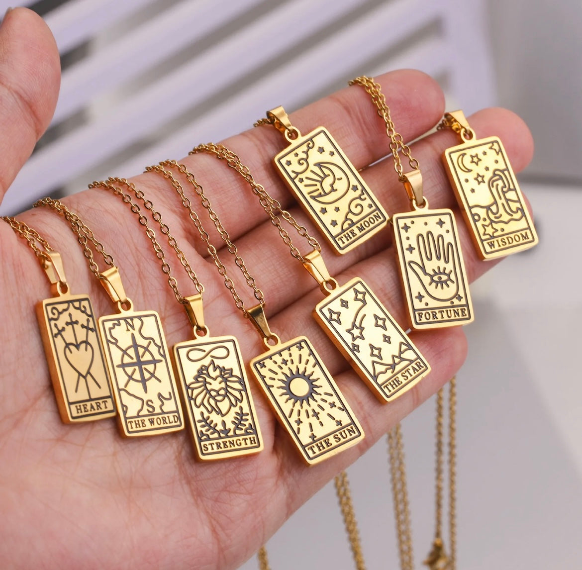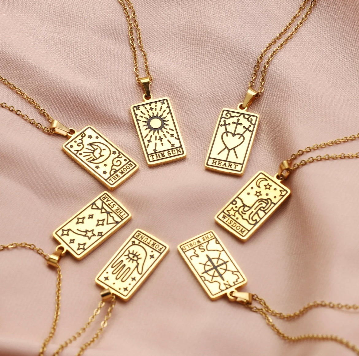 Tap into lunar magic and timeless mysticism with The Moon Tarot Pendant Necklace from our Retro Tarot Collection. Inspired by classic tarot imagery, this pendant showcases the enigmatic Moon card—signifying intuition, hidden truths, and introspective insight. Available in elegant gold or silver finishes, it’s a captivating accessory whether worn alone or layered.