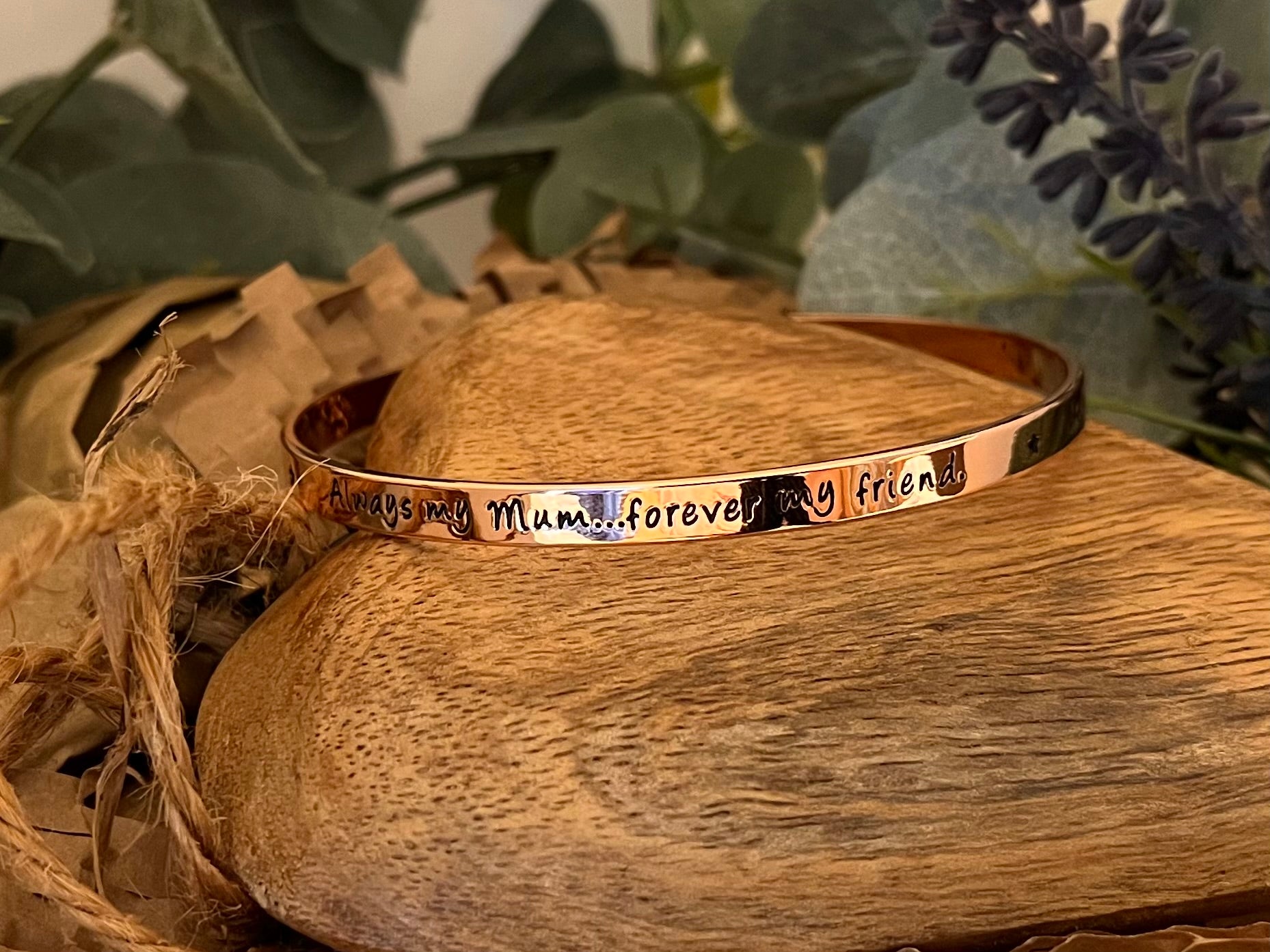 Introducing Lisa Angel's Meaningful Words Bangle in elegant rose gold. Show your appreciation with the engraved phrase 'Always my mum, Forever my friend'. The bracelet also features two cute little free-moving charms; a family tree and a heart outline, and is a thoughtful and stylish gift, perfect for any occasion. Let your mother know she's always in your heart with this special piece.