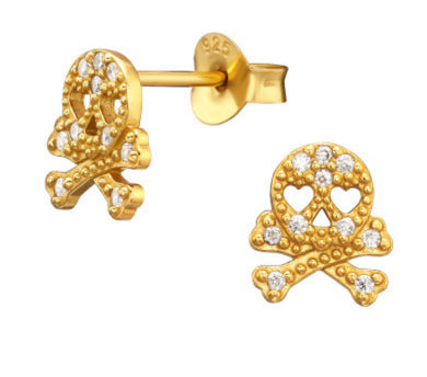 Skull and Cross Bones Stud Earrings Gold Plated Sterling Silver