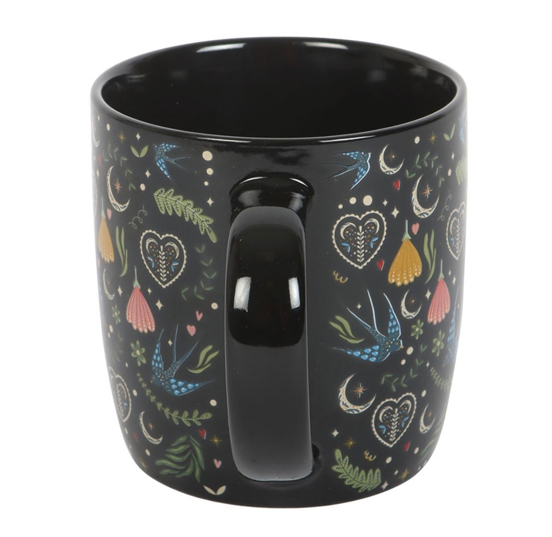 Sip your favourite hot drink with our Black Midnight Bloom Print Mug. Elegant black floral and celestial design, perfect for coffee, tea, or gifting to moon and mystical décor lovers.