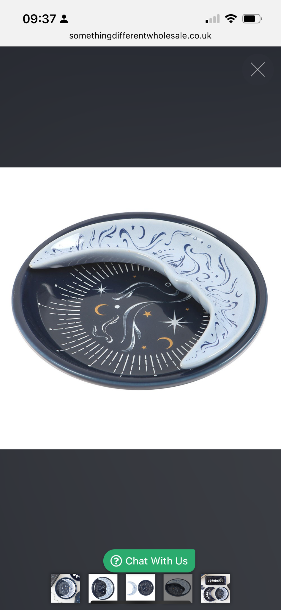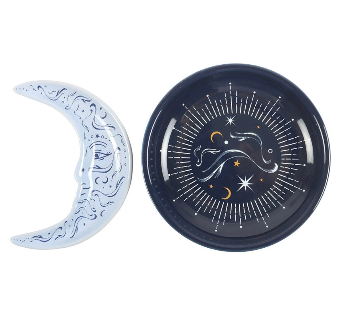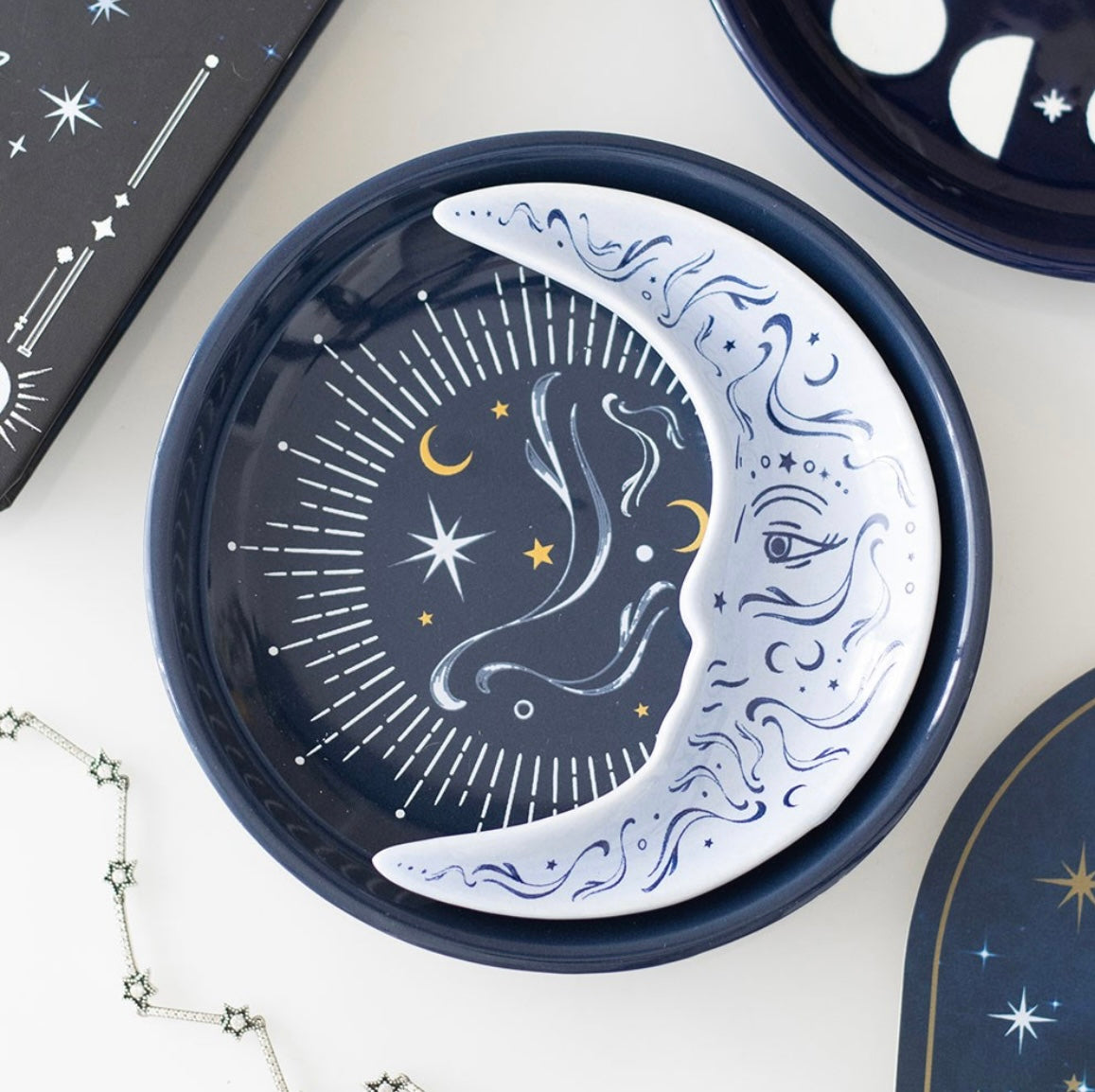 Featuring three beautifully printed dishes stacked in a gentle curve, this piece is perfect for holding jewellery, crystals, rings, or other precious keepsakes. Its deep blue tones and moon phase artwork bring a touch of cosmic elegance to your space — a stunning addition to any dresser, bedside table, or altar.
