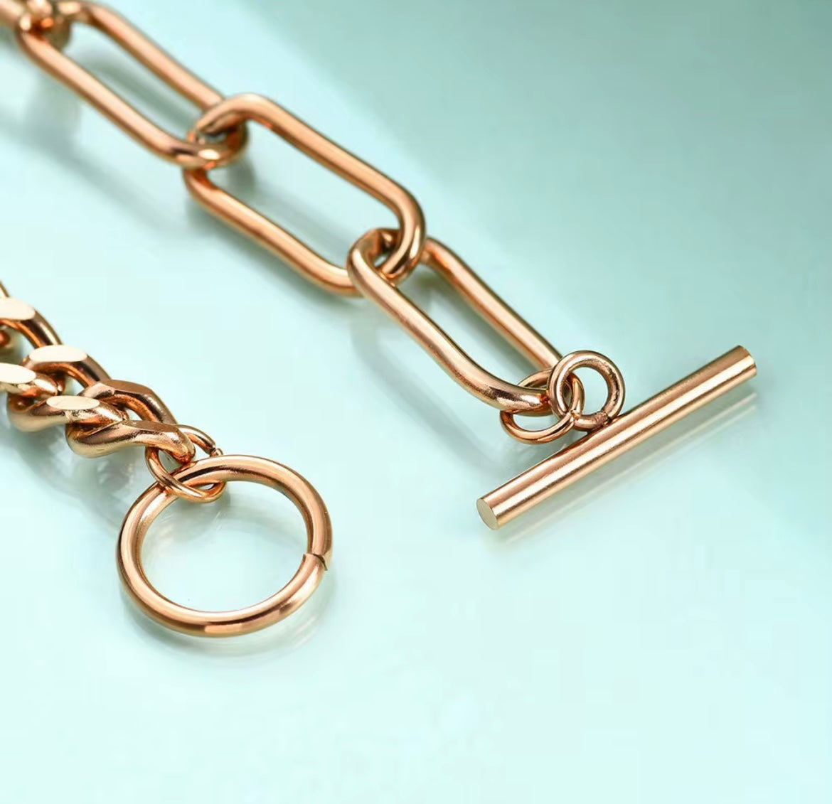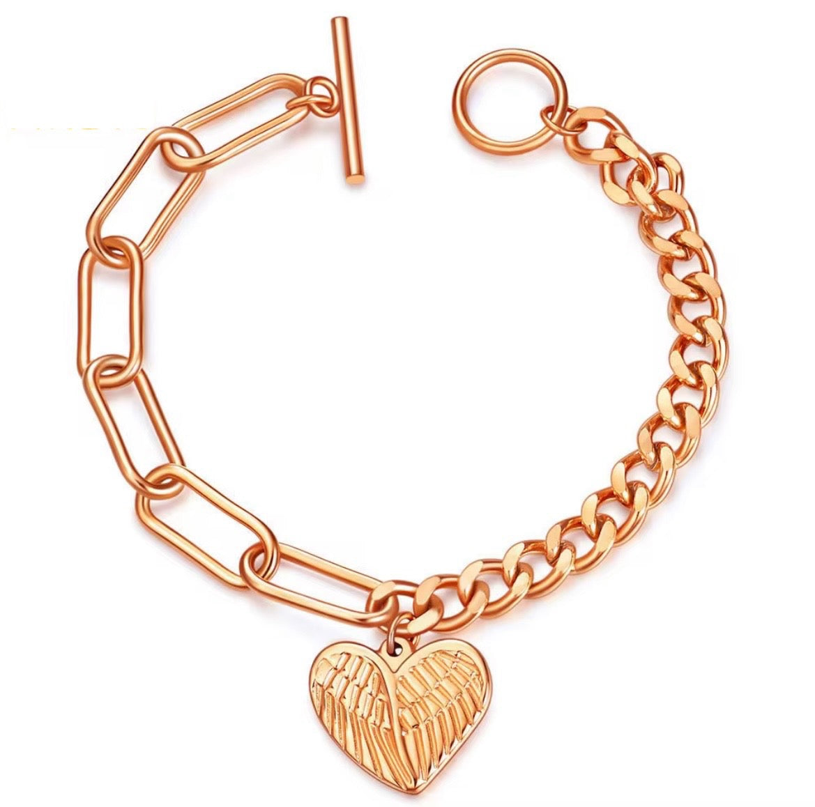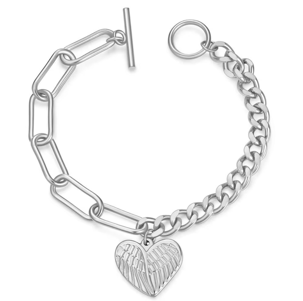 This stunning bracelet features a chunky design with a Tbar fastening for easy wear. Made from high-quality stainless steel, it comes plated in your choice of gold, rose gold, or platinum. The charm on the bracelet is shaped like angel wings in a loveheart shape, adding a touch of angelic elegance to your look.